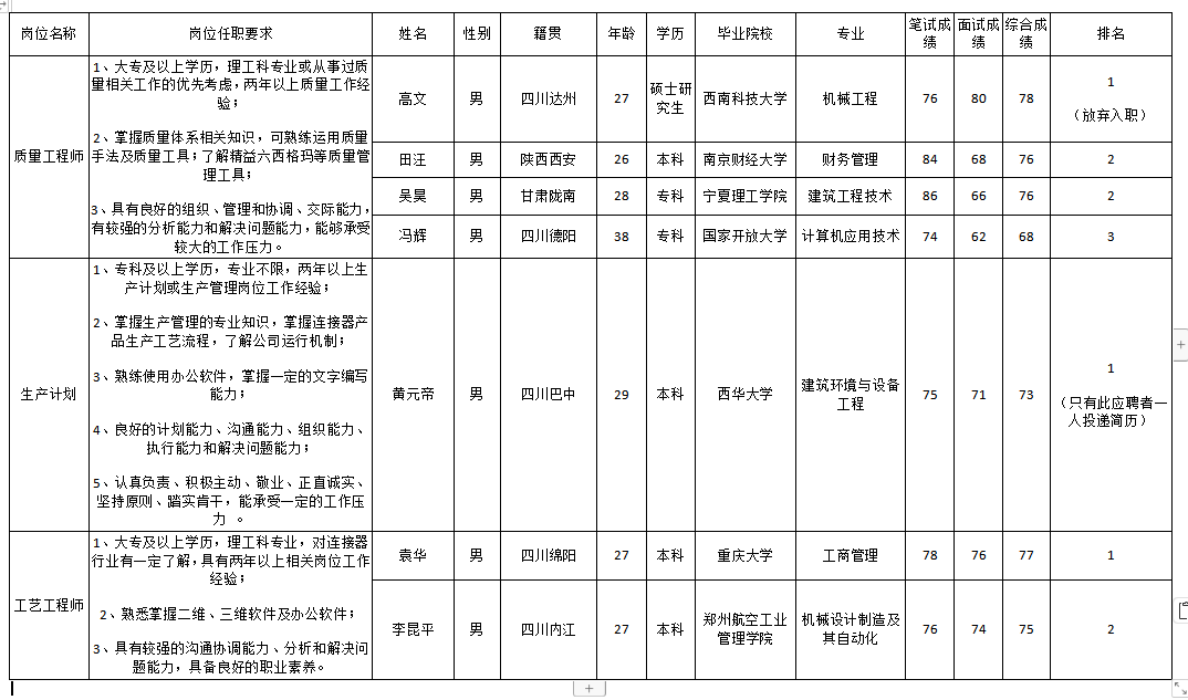 根據(jù)四川華豐科技股份有限公司發(fā)布的招聘公告及招聘相關(guān)規(guī)定,經(jīng)筆試、面試等程序,現(xiàn)將筆試(面試)成績予以公示。