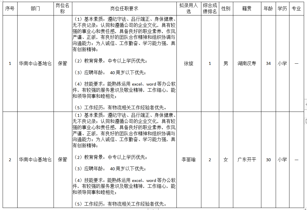 根據(jù)四川長(zhǎng)虹民生物流股份有限公司發(fā)布的招聘公告及招聘相關(guān)規(guī)定,經(jīng)面試、體檢等程序,擬錄用徐旋等2名同志到四川長(zhǎng)虹民生物流股份有限公司工作,現(xiàn)予以公示,具體情況如下: