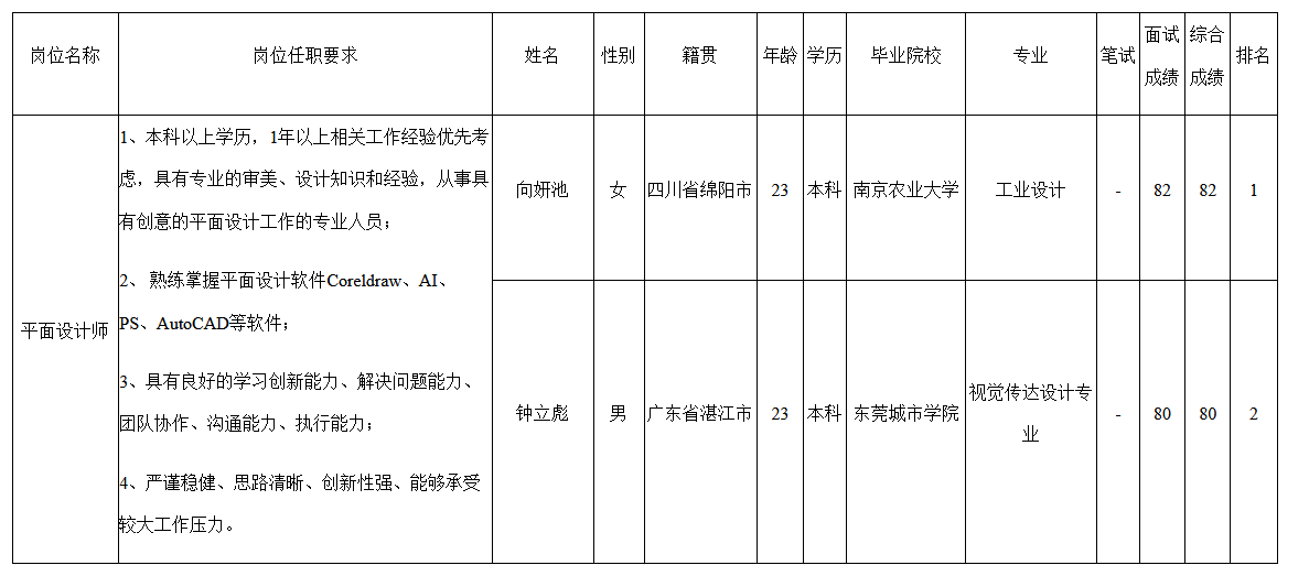 根據(jù)中山長虹電器有限公司發(fā)布的招聘公告及招聘相關(guān)規(guī)定,經(jīng)面試程序,現(xiàn)將面試成績予以公示。