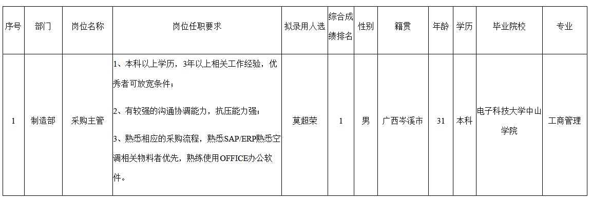 根據(jù)中山長虹電器有限公司發(fā)布的招聘公告及招聘相關(guān)規(guī)定,經(jīng)面試、考察、體檢等程序,擬錄用莫超榮同志到采購主管崗位工作,現(xiàn)予以公示,具體情況如下: