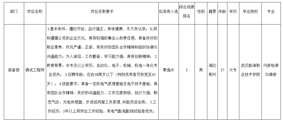 根據(jù)深圳九州光電子技術有限公司發(fā)布的招聘公告及招聘相關規(guī)定,經(jīng)筆試、面試、考察、體檢等程序,擬錄用秦逸夫同志到深圳九州光電子技術有限公司工作,現(xiàn)予以公示,具體情況如下: