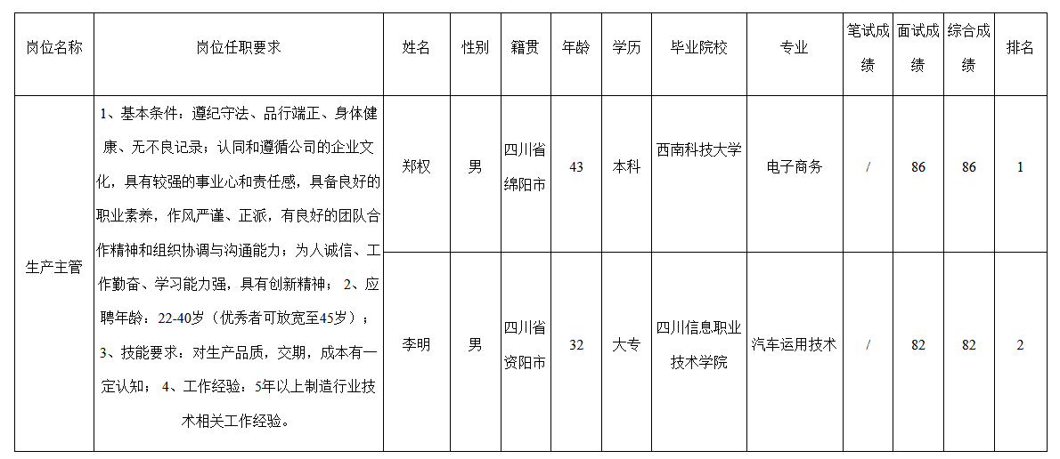 根據四川九華光子通信技術有限公司發(fā)布的招聘公告及招聘相關規(guī)定,經筆試、面試等程序,現將筆試(面試)成績予以公示。