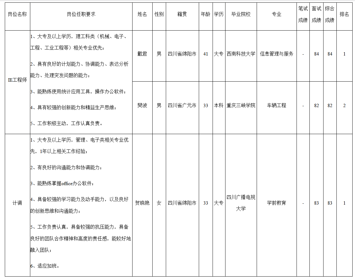 根據(jù)四川九州電子科技股份有限公司發(fā)布的招聘公告及招聘相關(guān)規(guī)定,經(jīng)筆試、面試等程序,現(xiàn)將筆試(面試)成績予以公示。