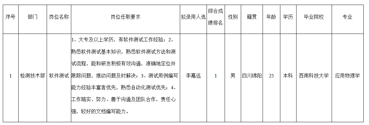 根據(jù)四川長虹新網(wǎng)科技有限責任公司發(fā)布的招聘公告及招聘相關規(guī)定,經(jīng)筆試、面試、考察、體檢等程序,擬錄用李嘉遠同志到四川長虹新網(wǎng)科技有限責任公司工作,現(xiàn)予以公示,具體情況如下: