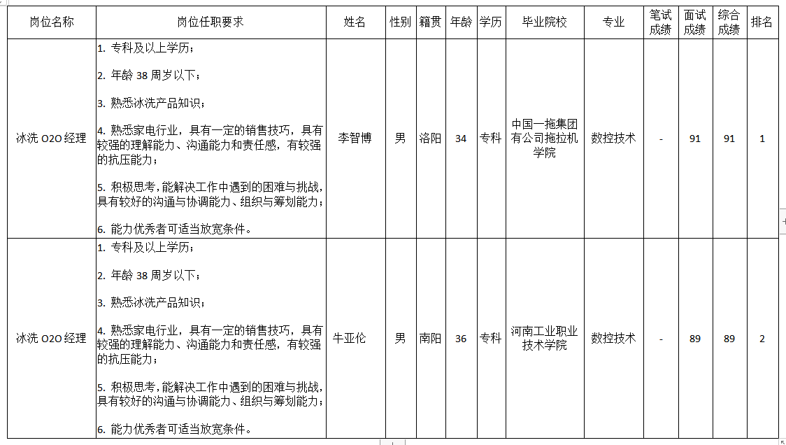 根據(jù)四川智易家網(wǎng)絡(luò)科技有限公司(長虹·美菱中國區(qū))發(fā)布的招聘公告及招聘相關(guān)規(guī)定,經(jīng)初試、復(fù)試等程序,現(xiàn)將面試成績予以公示。
