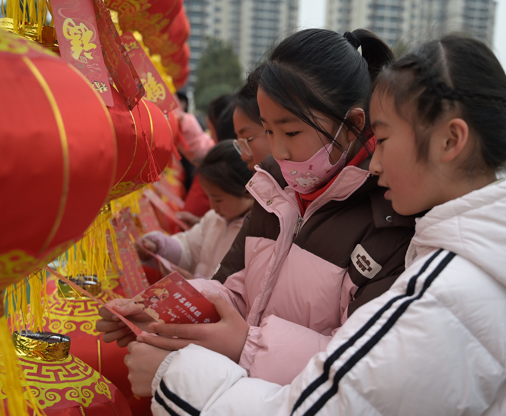 中國紅、龍元素、漢服飾、非遺文化,共同營造出國風濃郁、喜慶歡樂的校園迎新氛圍。萌萌的“小龍人”、腳踩高蹺的“氣球人”……熱情地和孩子們打著招呼,送著祝福。操場上,“魚躍龍門”“祥龍獻瑞”“龍行大運”“畫龍點睛”……一個個寓意美好、年味兒十足的趣味游園活動,讓孩子們興趣盎然。寫“福”字,猜燈謎,制作一個湯圓“表情包”,蒙上眼睛給龍貼眼睛……快樂的歡呼聲、助威聲此起彼伏,響徹校園。糖葫蘆、棉花糖、藝術(shù)氣球、糖畫的攤位旁更是人頭攢動,擠滿了來兌換獎品的孩子們。非遺匠人們靈動的手指上下飛舞,左右穿梭,頃刻間,一條糖做的“龍”、一串冰糖葫蘆、一頂氣球捏成的帽子……神奇地握在了孩子們的手中,驚嘆的眼神后,“耶”的呼喊聲便從這里響起。