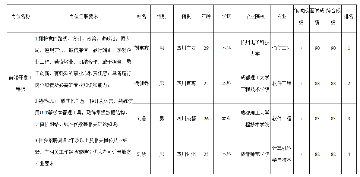 根據(jù)四川九強(qiáng)通信科技有限公司發(fā)布的招聘公告及招聘相關(guān)規(guī)定,經(jīng)筆試、面試等程序,現(xiàn)將筆試(面試)成績予以公示。