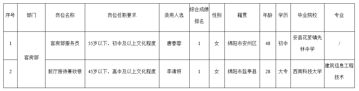 根據(jù)綿陽市綿州嘉來會務(wù)服務(wù)有限公司發(fā)布的招聘公告及招聘相關(guān)規(guī)定,經(jīng)面試、體檢等程序,錄用以下人員到客房部工作,現(xiàn)予以公示,具體情況如下: