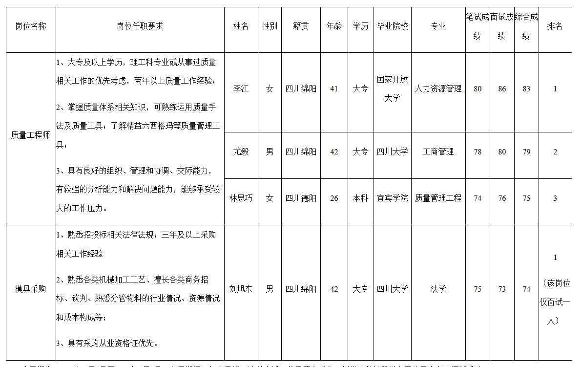 根據(jù)四川華豐科技股份有限公司發(fā)布的招聘公告及招聘相關(guān)規(guī)定,經(jīng)筆試、面試等程序,現(xiàn)將筆試(面試)成績(jī)予以公示。