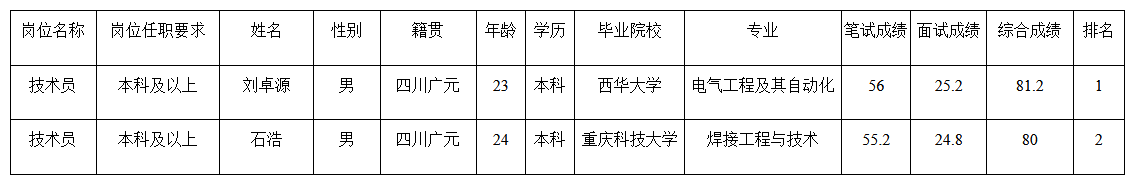 根據(jù)零八一電子集團(tuán)四川天源機(jī)械有限公司發(fā)布的招聘公告及招聘相關(guān)規(guī)定,經(jīng)筆試、面試等程序,現(xiàn)將筆試(面試)成績(jī)予以公示。