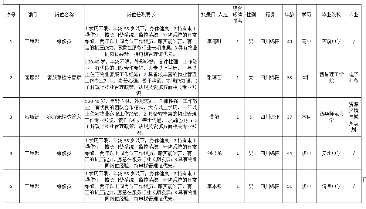 根據(jù)四川長(zhǎng)虹物業(yè)服務(wù)有限責(zé)任公司綿陽(yáng)分公司發(fā)布的招聘公告及招聘相關(guān)規(guī)定,經(jīng)筆試、面試、考察、體檢等程序,擬錄用李德財(cái)、張瓊藝、黃娟、劉顯龍、李本銀到安州世紀(jì)城、金嶺1號(hào)管理處工作?,F(xiàn)予以公示,具體情況如下: