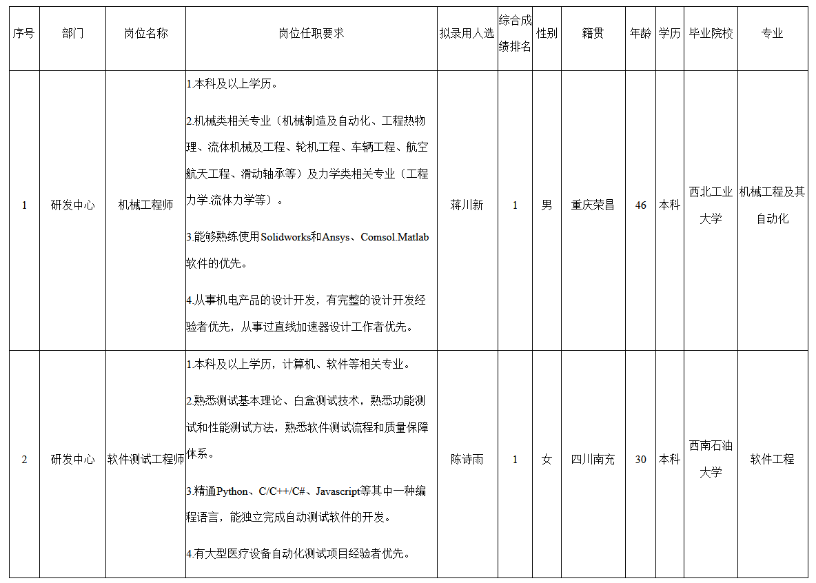 根據(jù)中玖閃光醫(yī)療科技有限公司發(fā)布的招聘公告及招聘相關(guān)規(guī)定,經(jīng)過(guò)篩選、面試、體檢等程序,擬錄用蔣川新、陳詩(shī)雨等同志到中玖閃光醫(yī)療科技有限公司工作,現(xiàn)予以公示,具體情況如下: