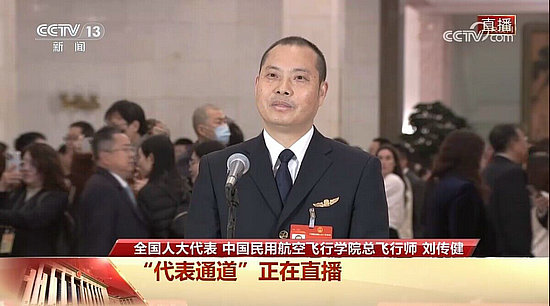 走上“代表通道”的劉傳健,身著帥氣的機(jī)長服。2022年,他從川航調(diào)任中飛院任總飛行師,但每年仍堅持飛行200小時以上,機(jī)長身份仍在。