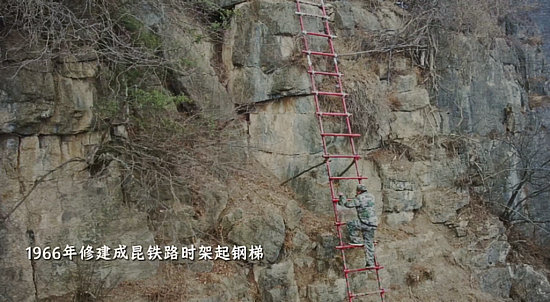 1966年修建成昆鐵路的鐵道兵們?yōu)楣怕反宕迕瘢谕ㄍ饨绲奶偬莸幕A(chǔ)上焊起鋼梯。