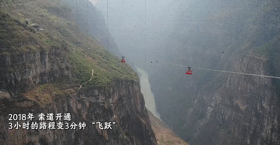 2018年,跨度為760米的索道正式開通,村民們3小時(shí)的崎嶇懸崖路只需要3分鐘就可“飛躍”。