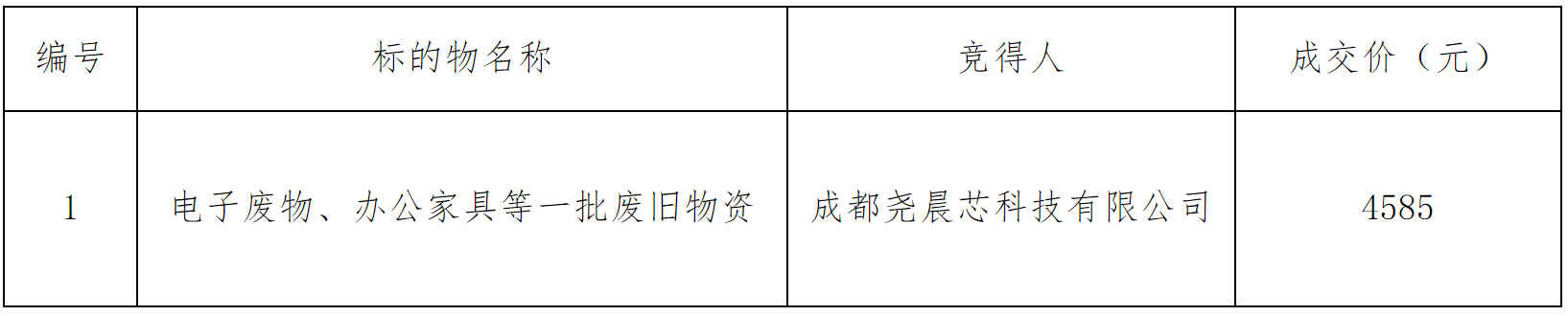 經(jīng)綿陽(yáng)市財(cái)政局批準(zhǔn),我中心于2024年3月5日在綿陽(yáng)市公共資源交易電子交易系統(tǒng)網(wǎng)上競(jìng)價(jià)方式公開(kāi)處置“電子廢物、辦公家具等廢舊物資”一批,現(xiàn)將成交結(jié)果公示如下: