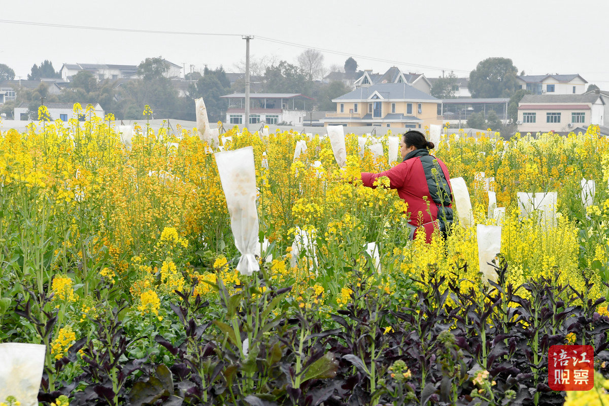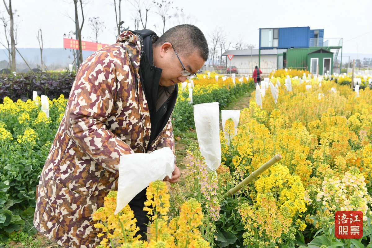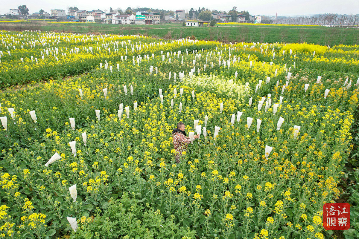 3月5日,在位于綿陽(yáng)游仙區(qū)新橋鎮(zhèn)勝黎路一側(cè)的一大片油菜田里,一株株套著白色育種袋的油菜花顯得格外醒目,每一株上面還系著一個(gè)手寫(xiě)掛牌。田埂間,“新農(nóng)人”袁中勇和妻子正對(duì)套著袋子的油菜花挨個(gè)進(jìn)行檢查。隨著油菜花的生長(zhǎng),育種袋的高度需要及時(shí)調(diào)整。