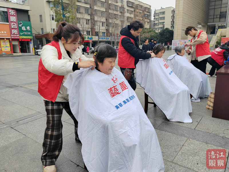 活動(dòng)中,大家來(lái)到轄區(qū)廣場(chǎng)為老人免費(fèi)理發(fā)。只見(jiàn)家長(zhǎng)們一只手拿著剪刀,一只手拿著梳子,神情專(zhuān)注地為老人剪發(fā),孩子們則在一旁協(xié)助理發(fā),有的為老人整理衣服,有的為老人捶腿揉肩。