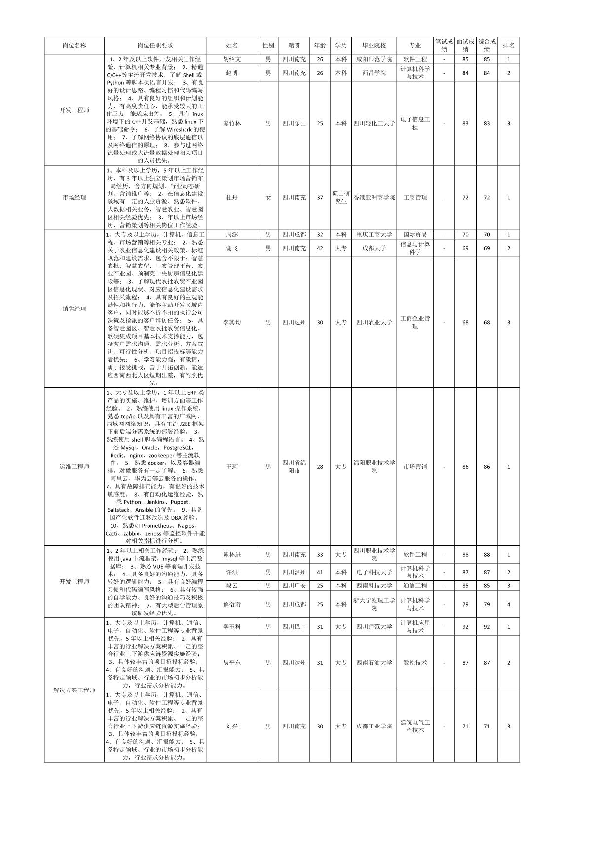 根據(jù)成都九州電子信息系統(tǒng)股份有限公司發(fā)布的招聘公告及招聘相關(guān)規(guī)定,經(jīng)筆試、面試等程序,現(xiàn)將筆試(面試)成績(jī)予以公示。