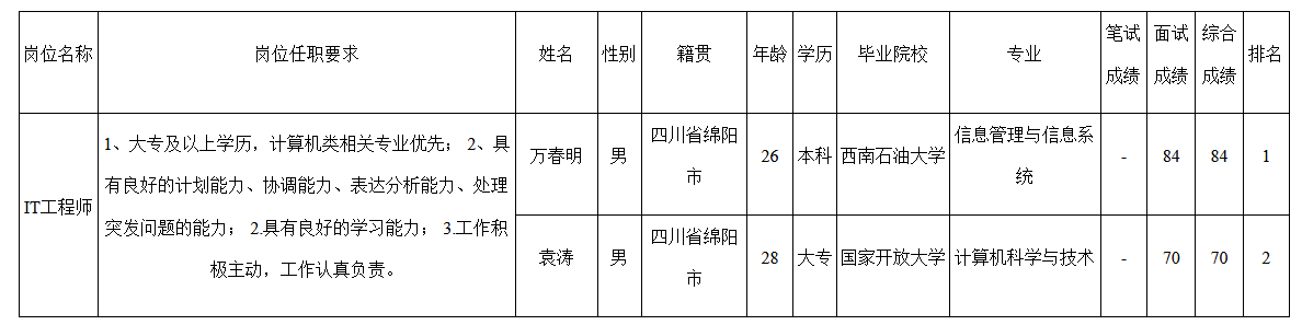 根據(jù)四川九州電子科技股份有限公司發(fā)布的招聘公告及招聘相關(guān)規(guī)定,經(jīng)筆試、面試等程序,現(xiàn)將筆試(面試)成績(jī)予以公示。