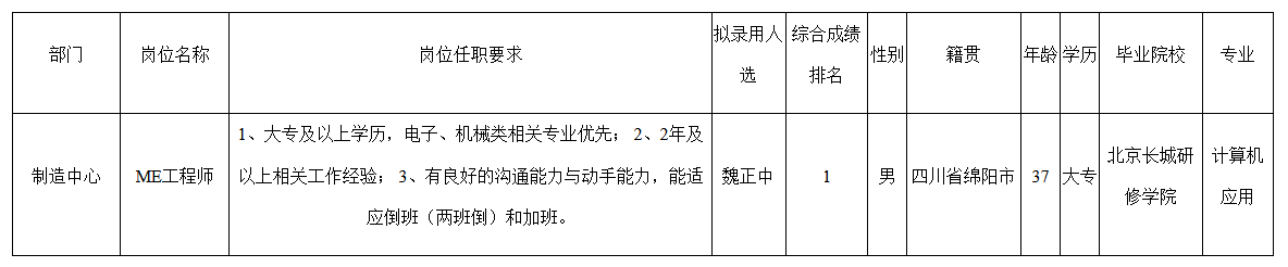 根據(jù)四川九州電子科技股份有限公司發(fā)布的招聘公告及招聘相關(guān)規(guī)定,經(jīng)筆試、面試、考察、體檢等程序,擬錄用魏正中同志到四川九州電子科技股份有限公司工作,現(xiàn)予以公示,具體情況如下: