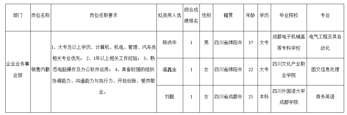 根據(jù)四川九州電子科技股份有限公司發(fā)布的招聘公告及招聘相關(guān)規(guī)定,經(jīng)筆試、面試、考察、體檢等程序,擬錄用陳洪華,溫鑫金,劉靚同志到四川九州電子科技股份有限公司工作,現(xiàn)予以公示,具體情況如下: