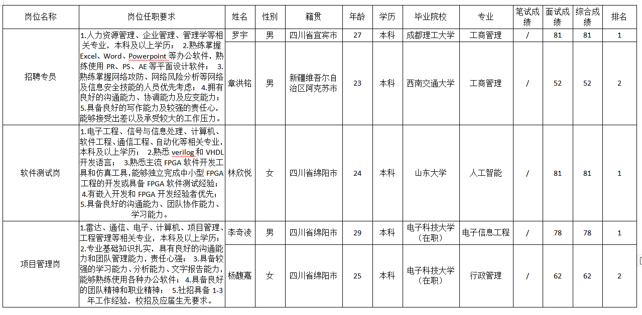 根據(jù)四川九州電器集團有限責(zé)任公司發(fā)布的招聘公告及招聘相關(guān)規(guī)定,經(jīng)筆試、面試等程序,現(xiàn)將筆試(面試)成績予以公示。