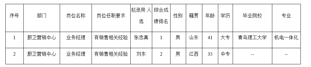 根據(jù)合肥長虹美菱生活電器有限公司發(fā)布的招聘公告及招聘相關(guān)規(guī)定,經(jīng)面試、體檢等程序,擬錄用張忠真、劉東同志到合肥長虹美菱生活電器有限公司工作,現(xiàn)予以公示,具體情況如下:
