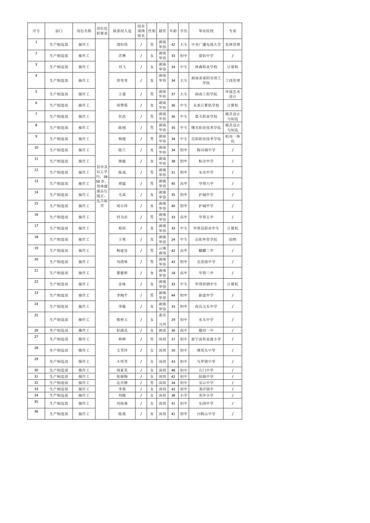 根據(jù)深圳長虹聚和源科技有限公司發(fā)布的招聘公告及招聘相關(guān)規(guī)定,經(jīng)筆試、面試、考察、體檢等程序,擬錄用以下同志到公司生產(chǎn)制造部工作,現(xiàn)予以公示,具體情況如下: