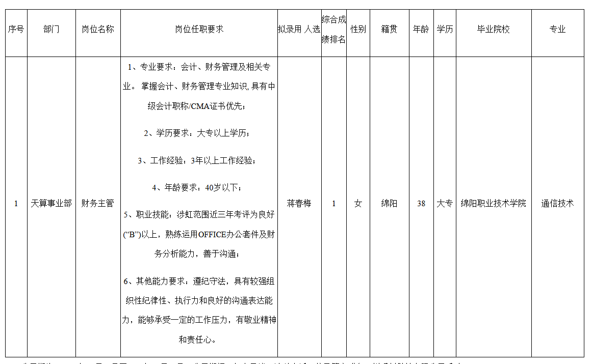 根據(jù)四川愛創(chuàng)科技有限公司發(fā)布的招聘公告及招聘相關(guān)規(guī)定,經(jīng)面試、考察、體檢等程序,擬錄用蔣春梅同志到天算事業(yè)部工作,現(xiàn)予以公示,具體情況如下:
