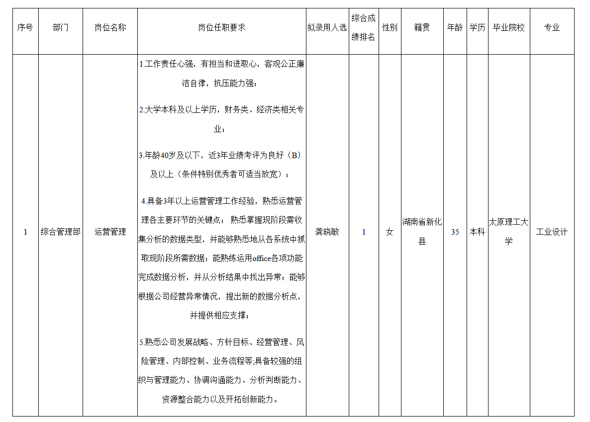 根據(jù)四川虹信軟件股份有限公司發(fā)布的招聘公告及招聘相關(guān)規(guī)定,經(jīng)筆試、面試、考察、體檢等程序,擬錄用龔曉敏同志到四川虹信軟件股份有限公司工作,現(xiàn)予以公示,具體情況如下: