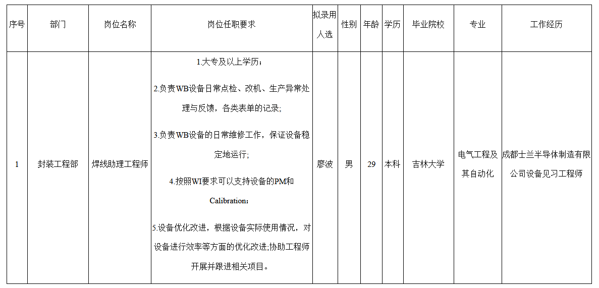 根據(jù)四川啟賽微電子有限公司發(fā)布的招聘公告及招聘相關(guān)規(guī)定,經(jīng)用人單位面試程序,現(xiàn)將擬錄用人員予以公示。