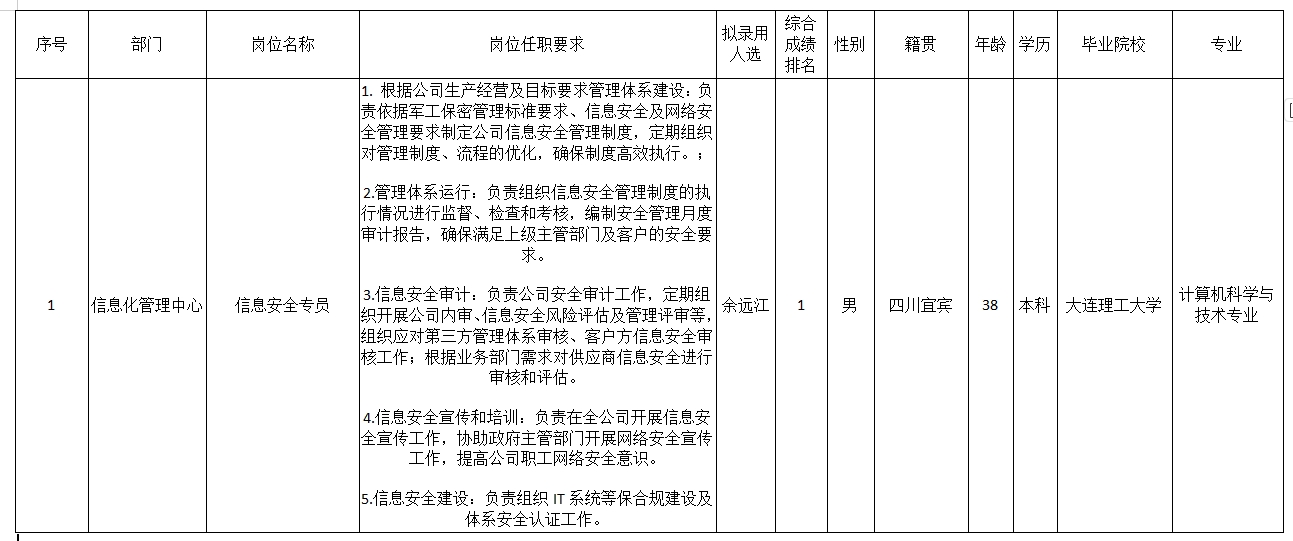 根據(jù)四川長(zhǎng)虹電源股份有限公司發(fā)布的招聘公告及招聘相關(guān)規(guī)定,經(jīng)筆試、面試、考察、體檢等程序,擬錄用余遠(yuǎn)江同志到我司工作,現(xiàn)予以公示,具體情況如下: