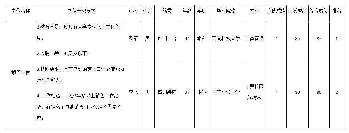 根據(jù)四川長(zhǎng)虹杰創(chuàng)鋰電科技有限公司發(fā)布的招聘公告及招聘相關(guān)規(guī)定,經(jīng)面試程序,現(xiàn)將面試成績(jī)予以公示。