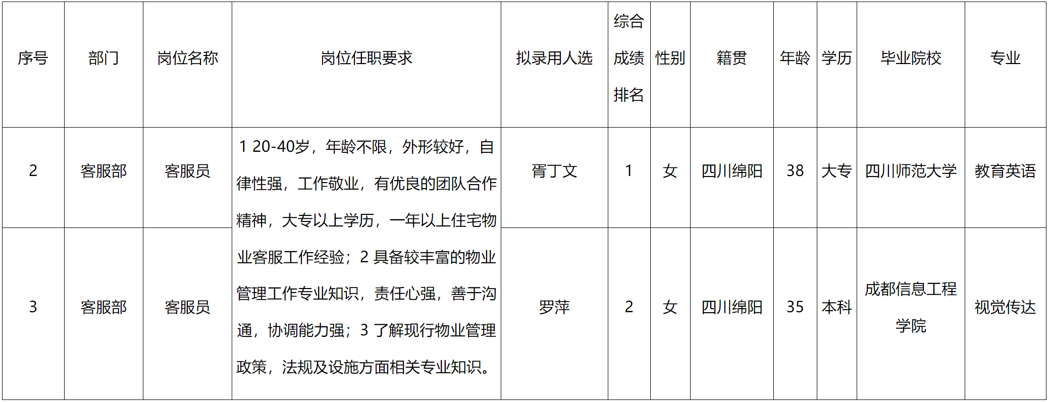 根據(jù)四川長(zhǎng)虹物業(yè)服務(wù)有限責(zé)任公司綿陽分公司發(fā)布的招聘公告及招聘相關(guān)規(guī)定,經(jīng)筆試、面試、考察、體檢等程序,擬錄用胥丁文、羅萍到金嶺1號(hào)管理處工作。現(xiàn)予以公示,具體情況如下: