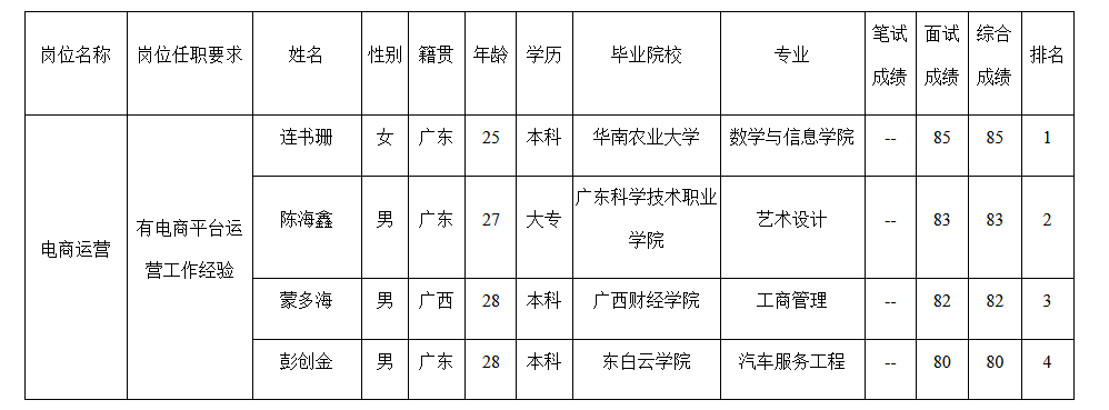 根據(jù)長虹美菱日電科技有限公司發(fā)布的招聘公告及招聘相關(guān)規(guī)定,經(jīng)面試程序,現(xiàn)將面試成績予以公示。