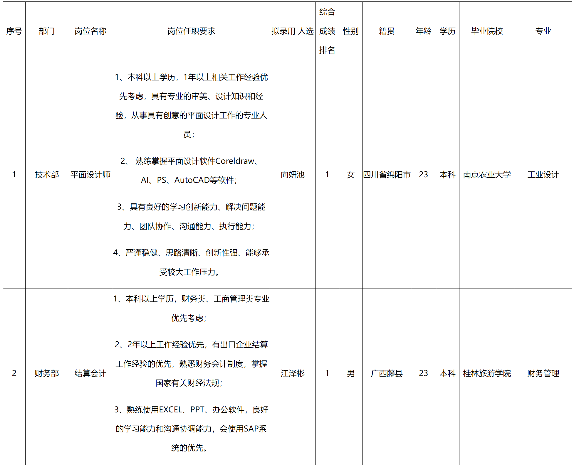 根據(jù)中山長虹電器有限公司發(fā)布的招聘公告及招聘相關(guān)規(guī)定,經(jīng)面試、考察、體檢等程序,擬錄用向妍池同志到平面設(shè)計(jì)師、江澤彬同志到結(jié)算會計(jì)崗位工作,現(xiàn)予以公示,具體情況如下: