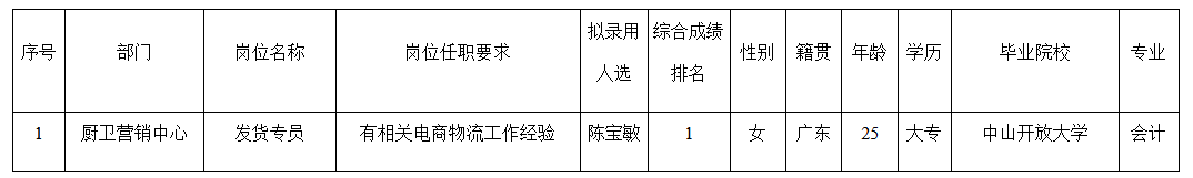 根據(jù)長(zhǎng)虹美菱日電科技有限公司發(fā)布的招聘公告及招聘相關(guān)規(guī)定,經(jīng)面試、體檢等程序,擬錄用陳寶敏同志到長(zhǎng)虹美菱日電科技有限公司工作,現(xiàn)予以公示,具體情況如下: