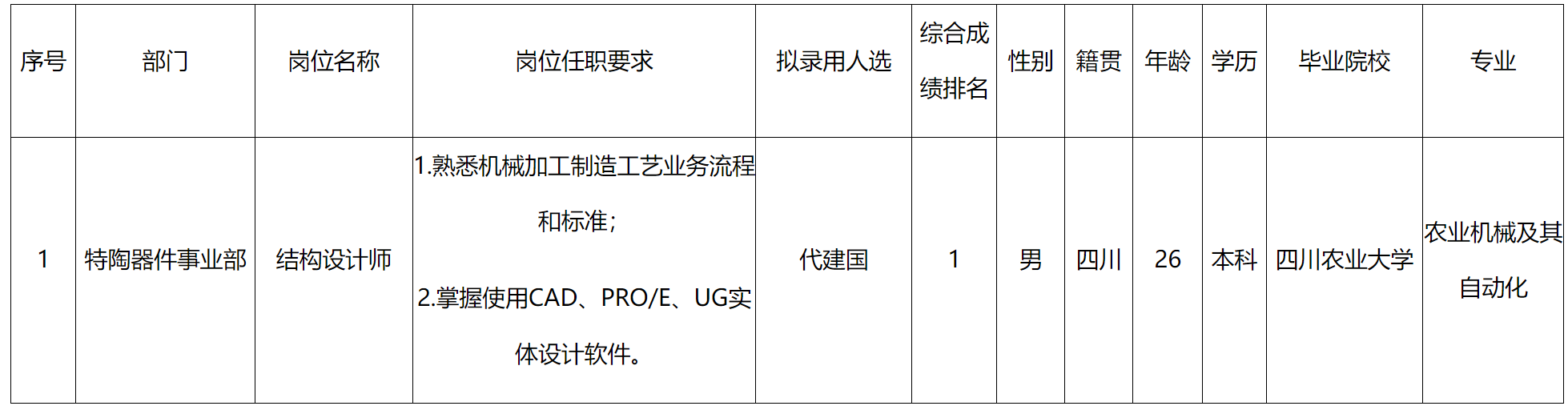 根據(jù)宜賓紅星電子有限公司發(fā)布的招聘公告及招聘相關(guān)規(guī)定,經(jīng)面試、考察、體檢等程序,擬錄用代建國同志到宜賓紅星電子有限公司工作,現(xiàn)予以公示,具體情況如下:
