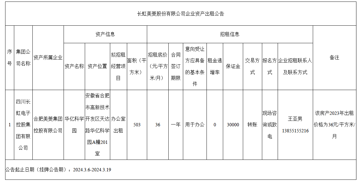 長虹美菱股份有限公司企業(yè)資產(chǎn)出租公告