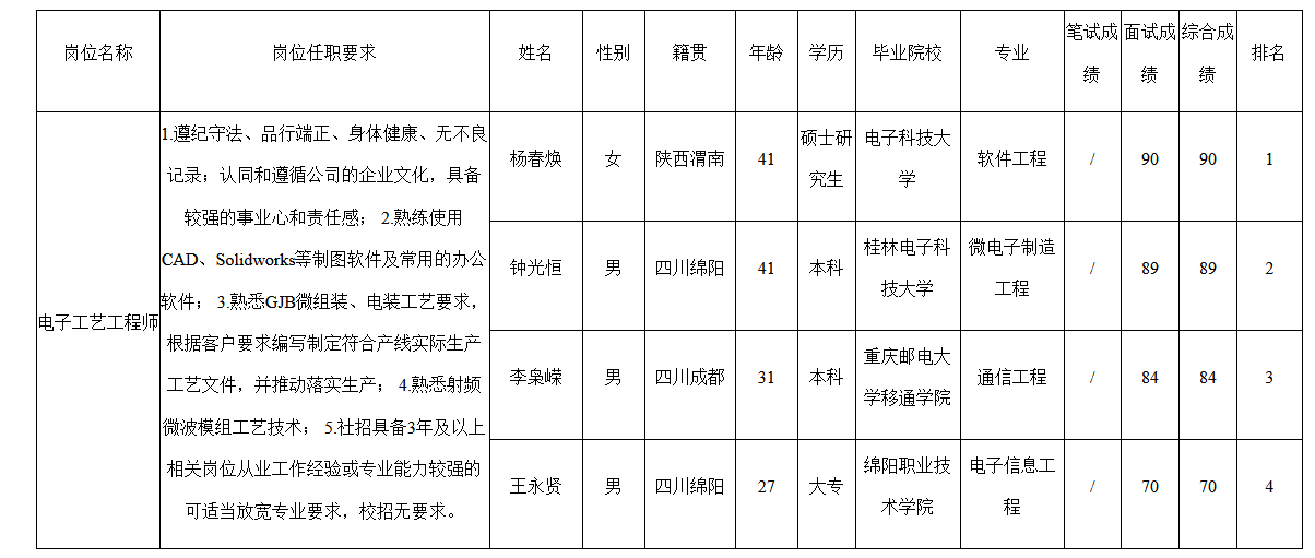 根據(jù)四川九強通信科技有限公司發(fā)布的招聘公告及招聘相關(guān)規(guī)定,經(jīng)筆試、面試等程序,現(xiàn)將筆試(面試)成績予以公示。