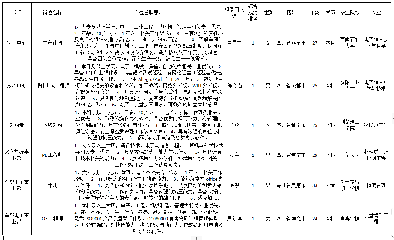 根據(jù)四川九州電子科技股份有限公司發(fā)布的招聘公告及招聘相關規(guī)定,經(jīng)筆試、面試、考察、體檢等程序,擬錄用蔣春容,曹雪梅,張宇,陳燕,易攀,陳文韜,羅新琪同志到四川九州電子科技股份有限公司工作,現(xiàn)予以公示,具體情況如下: