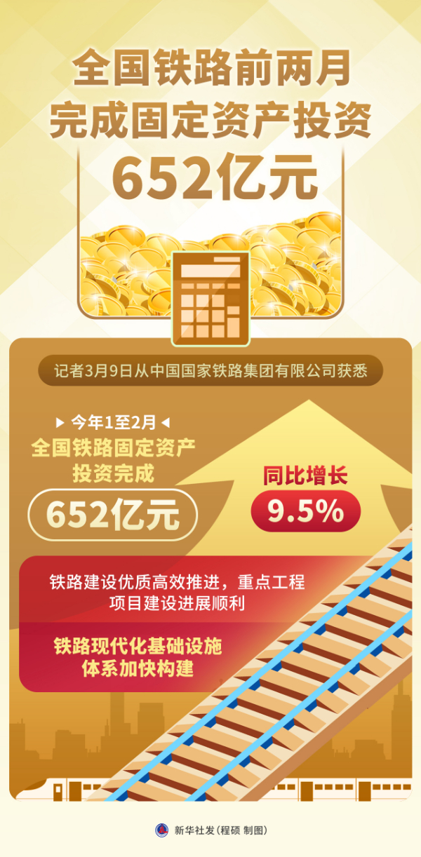 新華社北京3月9日電(記者樊曦)記者9日從中國國家鐵路集團(tuán)有限公司獲悉,今年1至2月,全國鐵路固定資產(chǎn)投資完成652億元,同比增長9.5%,鐵路建設(shè)優(yōu)質(zhì)高效推進(jìn),重點工程項目建設(shè)進(jìn)展順利,鐵路現(xiàn)代化基礎(chǔ)設(shè)施體系加快構(gòu)建。