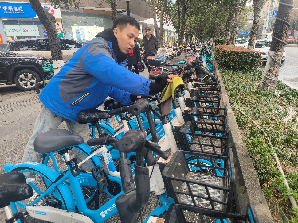單車回倉后,專業(yè)維修人員將對全身零部件進行全面檢查及更換,再進行高壓水槍噴洗、全車清潔擦拭、噴灑消毒等深度清洗,以保證車輛達到出庫標準。