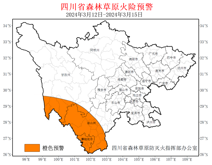 經(jīng)省森防指辦公室與省林草局、四川氣象局及相關(guān)地區(qū)會商,預(yù)計(jì)3月12日—15日攀枝花市,甘孜州西南部,涼山州西部、中部和南部(涉及17個(gè)縣級行政單位,具體范圍見附件)森林草原火險(xiǎn)等級將維持在高度危險(xiǎn)級別,特發(fā)布高森林草原火險(xiǎn)橙色預(yù)警。
