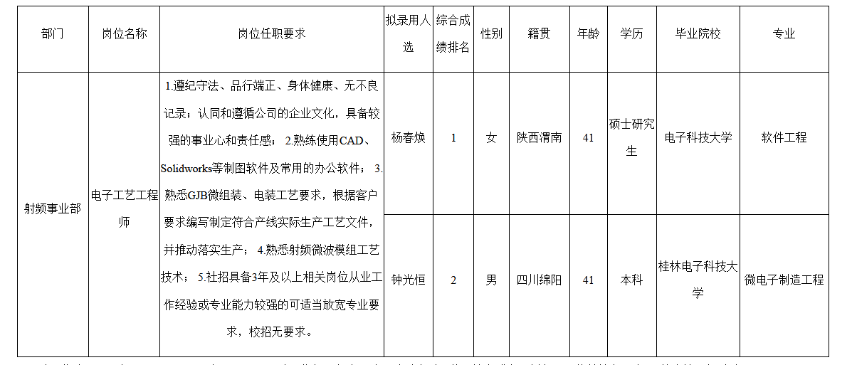 根據(jù)四川九強通信科技有限公司發(fā)布的招聘公告及招聘相關規(guī)定,經(jīng)筆試、面試、考察、體檢等程序,擬錄用楊春煥,鐘光恒同志到四川九強通信科技有限公司工作,現(xiàn)予以公示,具體情況如下: