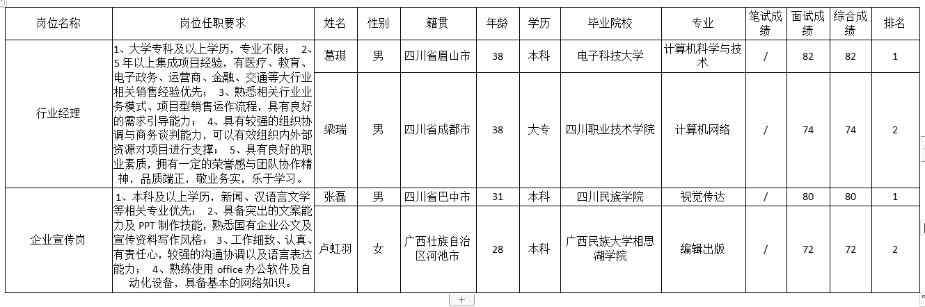 根據(jù)四川科瑞軟件有限責(zé)任公司發(fā)布的招聘公告及招聘相關(guān)規(guī)定,經(jīng)筆試、面試等程序,現(xiàn)將筆試(面試)成績(jī)予以公示。