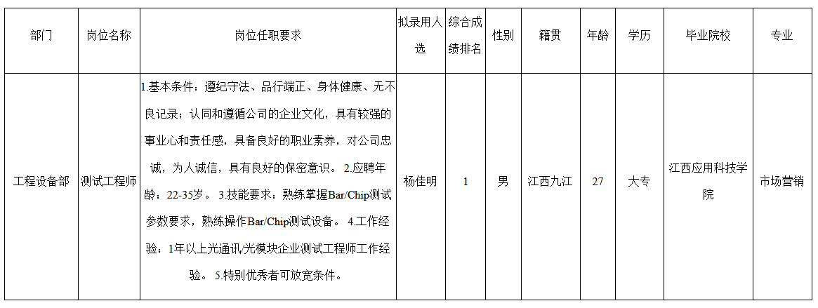 根據(jù)武漢九州芯技術(shù)有限公司發(fā)布的招聘公告及招聘相關(guān)規(guī)定,經(jīng)筆試、面試、考察、體檢等程序,擬錄用楊佳明同志到武漢九州芯技術(shù)有限公司工作,現(xiàn)予以公示,具體情況如下: