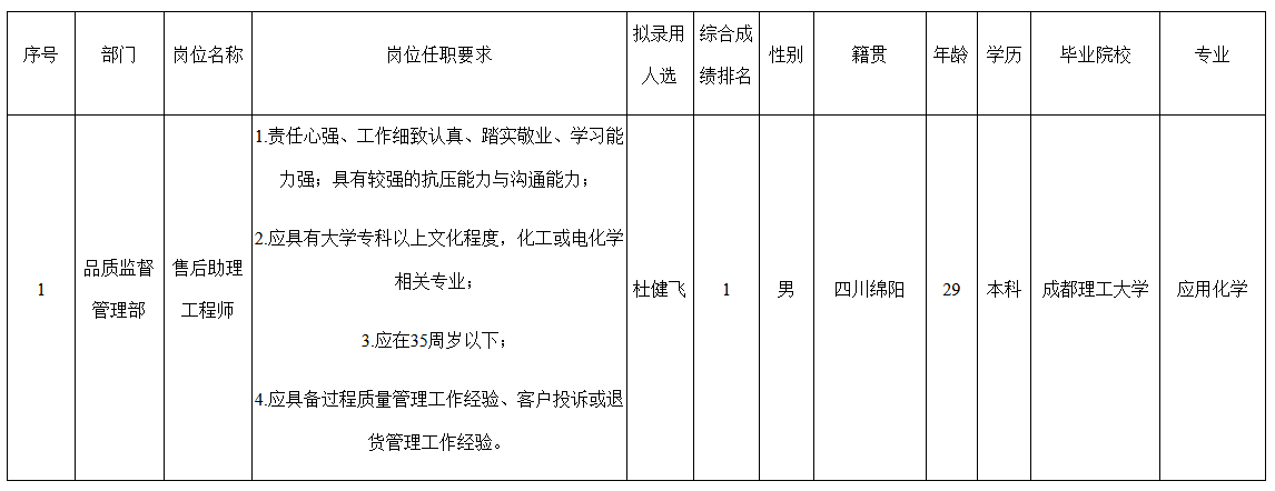 根據(jù)四川長(zhǎng)虹空調(diào)有限公司發(fā)布的招聘公告及招聘相關(guān)規(guī)定,經(jīng)面試、體檢等程序,擬錄用官濤到長(zhǎng)虹空調(diào)工作,現(xiàn)予以公示,具體情況如下: