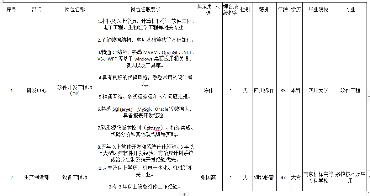根據(jù)中玖閃光醫(yī)療科技有限公司發(fā)布的招聘公告及招聘相關(guān)規(guī)定,經(jīng)過(guò)篩選、面試、體檢等程序,擬錄用陳偉、張國(guó)高等同志到中玖閃光醫(yī)療科技有限公司工作,現(xiàn)予以公示,具體情況如下: